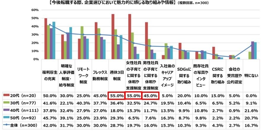 サンプル数が少ないものの、20代の回答を見ると他の年代とは違った傾向を見せています。「週休3日制度」と「女性社員の子育てに関する休暇や支援制度」が55.0%と半数を超え、また「男性社員の子育てに関する休暇や支援制度」が半数に迫る45.0%となっています。企業側は年代別で採用アプローチ方法を変えるといいかもしれません。
