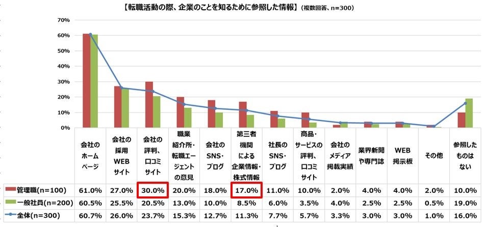 とはいっても、「面接で待遇面のことを詳しく聞きづらい…」などと思う方も多いと思います。そのような方のためにあるのが、企業の評判・口コミサイトや、第三者機関から出されている企業情報です。本調査でも、転職活動の際に参照した情報としてこれらが上位にランクインしていました。これらに掲載されている情報がすべて正しいとは限りませんが、情報収集の一環として適切に活用すれば、後悔の少ない転職ができる可能性が高まると考えられます。