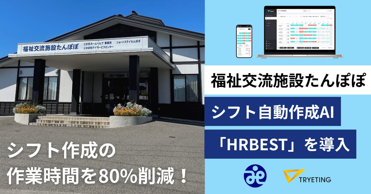名古屋大学発AIベンチャーの株式会社トライエッティング(本社:愛知県名古屋市、代表取締役社長:長江祐樹、以下、トライエッティング)は、社会福祉法人にかほ市社会福祉協議会が運営する福祉交流施設たんぽぽ(本社:秋田県にかほ市、管理者:小林英雄、以下、福祉交流施設たんぽぽ)にて、複雑なシフトもワンクリックで作成できる「HRBEST(ハーベスト)」が導入されたことをお知らせいたします。