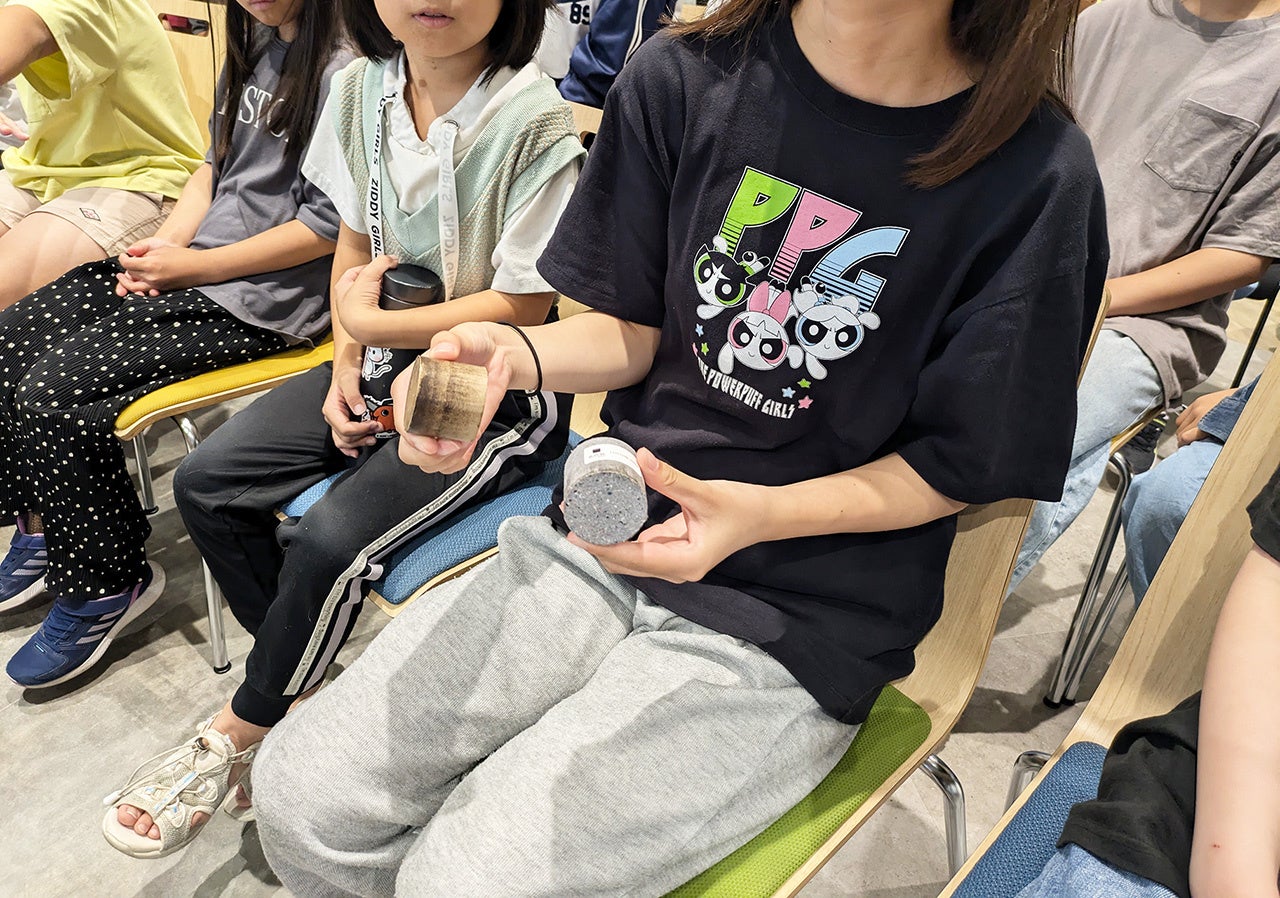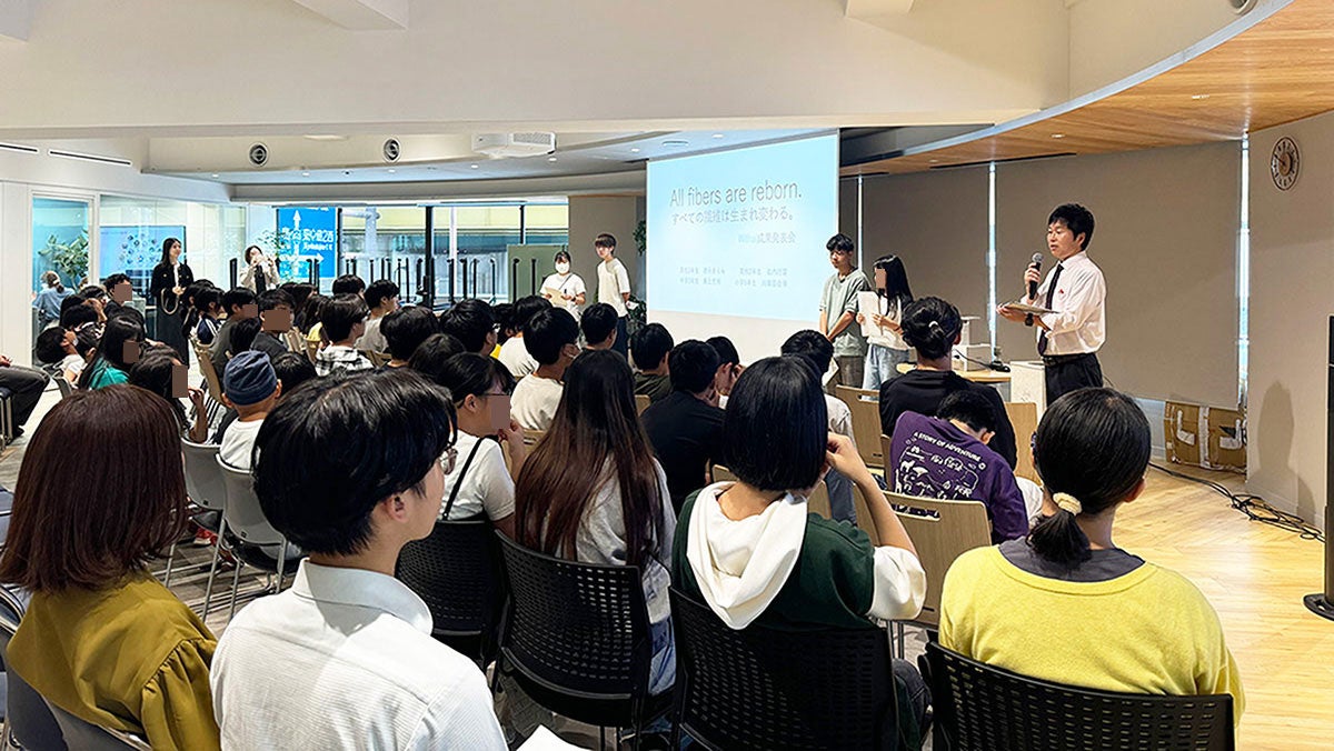 その最終講座にあたる成果発表会を9月27日、弊社2階ホールで開催しました。発表した子どもたち(小学5年生から高3生までの4人)は観覧者約80人の皆さんの前で、繊維の回収・再生に関する探究学習の成果と今後取り組むアイデアをプレゼンテーションしました。