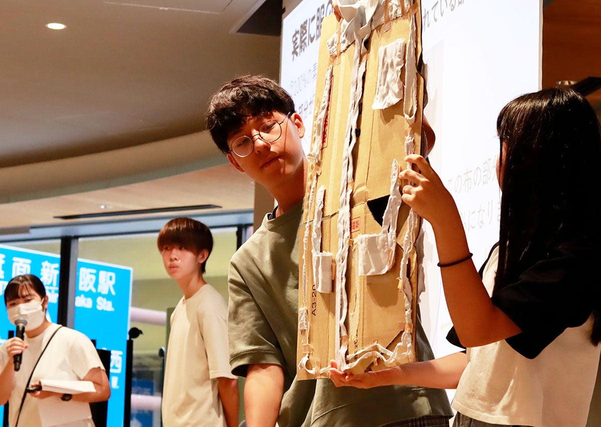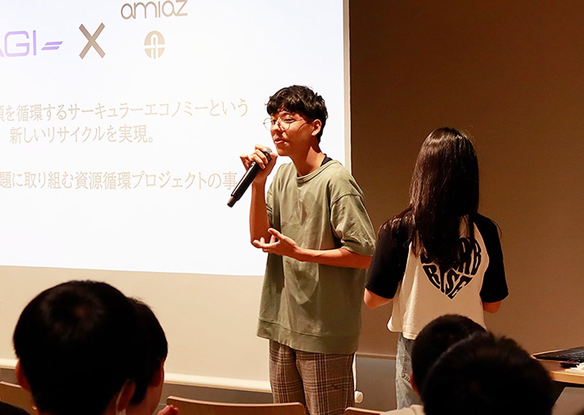 発表にあたった類学舎生にとって、今回の最終学習成果発表会は4カ月にわたった探究学習講座の総まとめ。講師をしてくれたヤギ社社員、同社のパートナー企業で繊維の循環プロジェクト「Withal(ウィゾール)」を展開するアミアズ社の社員の皆さんが見守る中、4人は観覧する大勢の皆さんの前で発表を始めました。