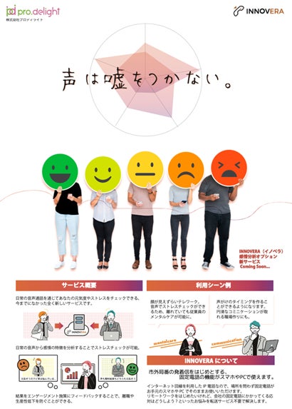 プロディライトが提供するクラウド電話システム「INNOVERA」のオプションサービスとして提供します(※2)。通話するアカウントごとに当オプションの選択が可能で、選択されたアカウントユーザの音声通話をもとに対象者の元気度をはじめとするストレスチェックを実施できます。