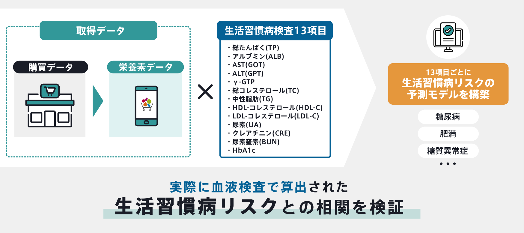 (3)SIRU+で変換された栄養素データから算出した生活習慣病リスクの予測モデルが、実際に血液検査で算出された⽣活習慣病リスク(生活習慣病13項目(※3)の数値)に対して相関するか検証します