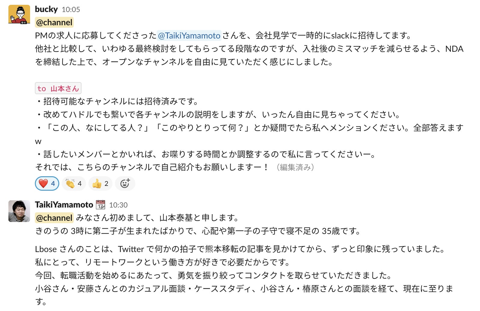 そのため、Slackを見学いただくことで、「1日の勤務イメージ」「組織のITリテラシー」「働き方の実態」「組織の心理的安全性」など様々な点を、入社前に知っていただくことが可能です。また、完全フルリモートという働き方は、世間一般から見るとまだまだ特殊な働き方で、「自分が完全フルリモートで働くことができるのか」と考えている採用候補者と出会うことも少なくありません。このような点も「Slack会社見学制度」で解決できると考えています。