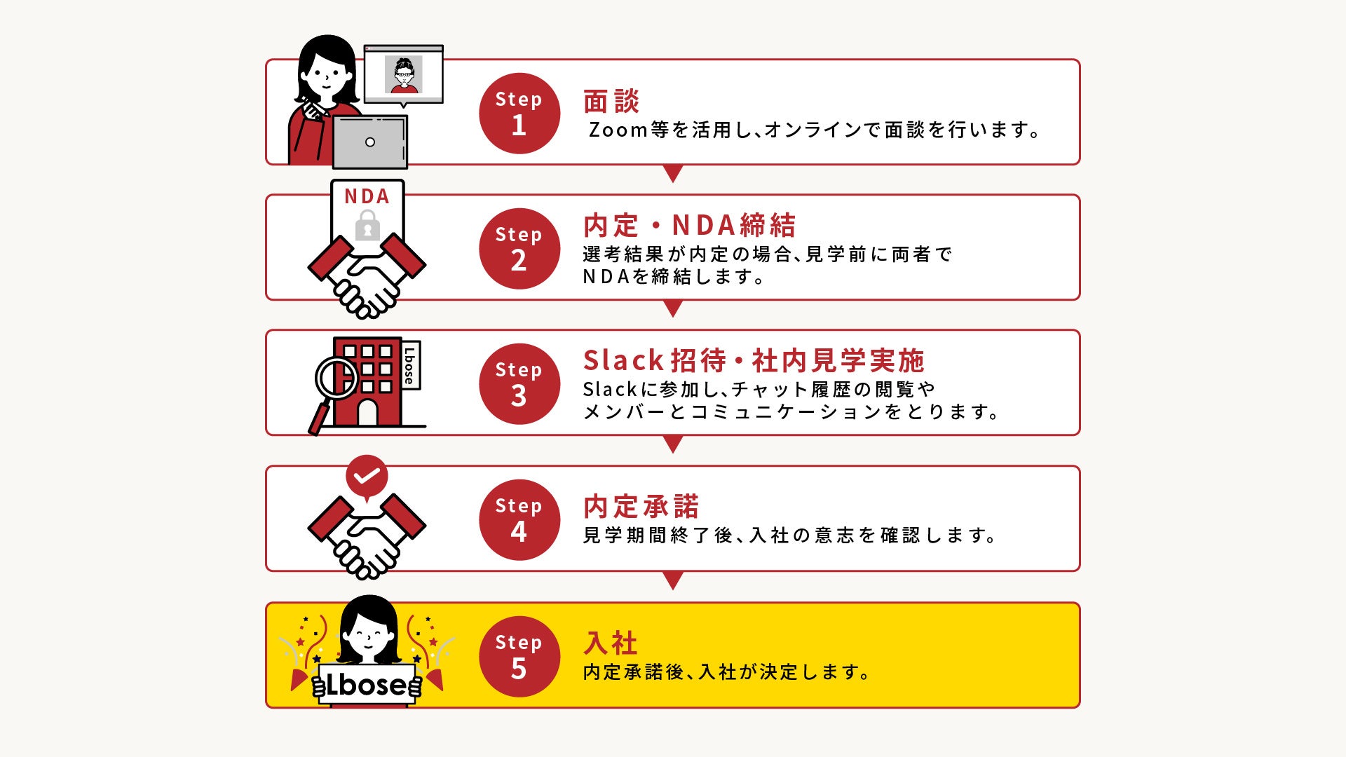 Slack会社見学は、Lboseが使用しているSlackに採用候補者を招待し、自由にSlack内を見学できる制度で、様々な観点から会社を見学し、入社の意思決定を行っていただくことを目的としています。NDA(秘密保持契約)締結後、採用候補者は社内の主要チャンネルへのアクセスが可能になり、全体定例への参加、気になるメンバーとのコミュニケーションなども行っていただくことが可能です。