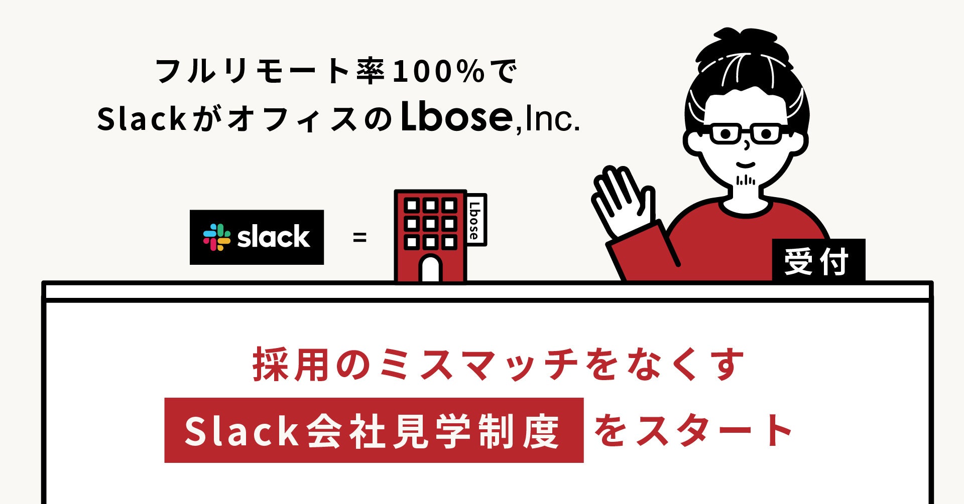 コロナ禍では、あらゆる企業で採用のオンライン化が進みました。採用のオンライン化によるメリットが多くある一方で、「会社の魅力を伝えづらい」「採用候補者の雰囲気が伝わりづらい」「採用候補者との距離を縮めることが難しい」などの課題も新たに生まれています。これらの課題を解決するため、Lboseでは「Slack会社見学制度」を開始しました。フルリモート率100%のLboseではSlackを単なる「チャットツール」ではなく「オフィス」と捉えており、あらゆる意思決定がSlack内で行われ、Slack内で完結しています。このような場に採用候補者を一定期間招待することで相互の理解を深め、採用におけるミスマッチの解消をはかります。