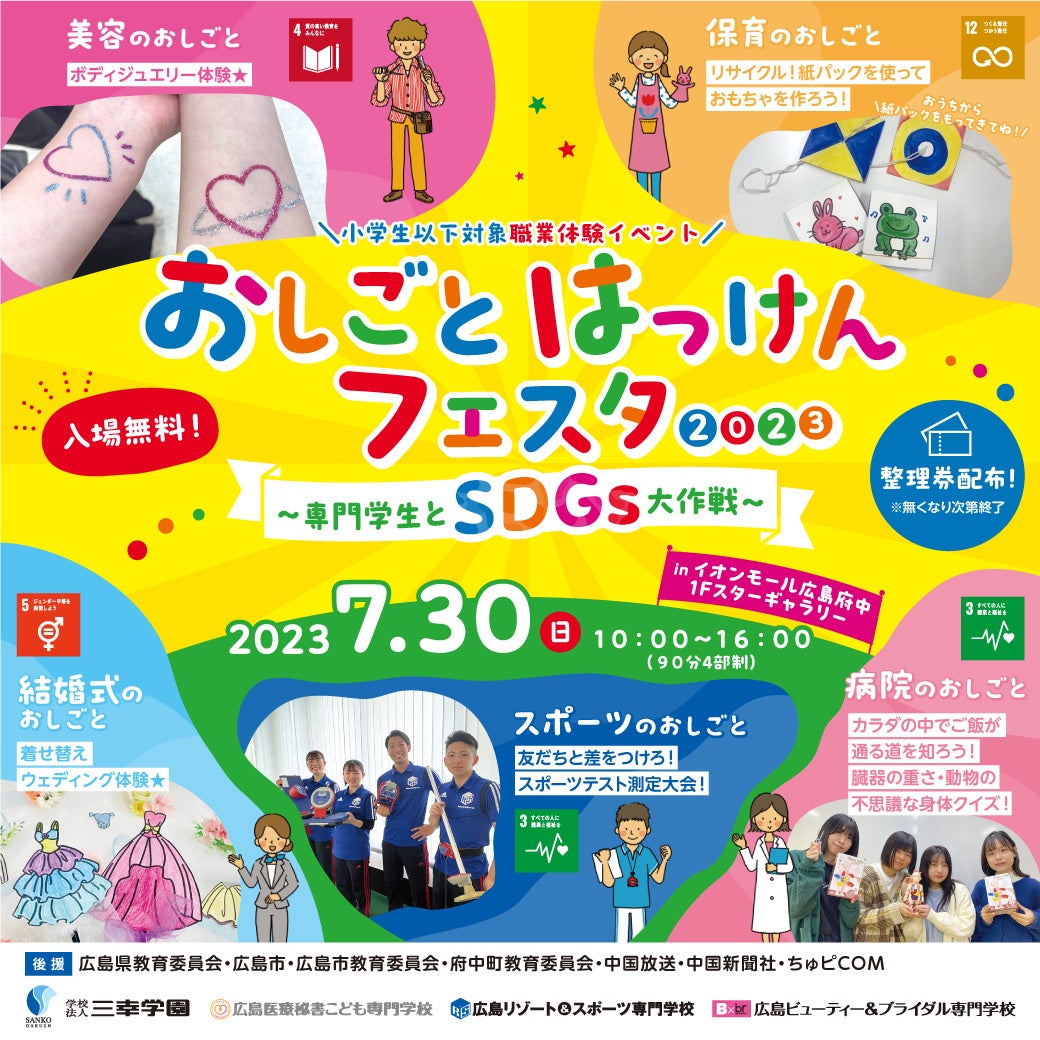 ■“おしごとはっけんフェスタ2023 inイオンモール広島府中 ~専門学生とSDGs大作戦~” 実施概要 ・開催日時:2023年7月30日(日)10:00~16:00(各回90分×4部制) ・開催場所:イオンモール広島府中 1Fスターギャラリー ・郵便番号:〒735-8588 広島県安芸郡府中町大須2丁目1−1 ・対象者 :小学生以下(未就学児含む) ※参加費無料 ・主 催 :学校法人三幸学園 ・参加校 :広島医療秘書こども専門学校、広島リゾート&スポーツ専門学校、広島ビューティー&ブライダル専門学校 ・後 援 :広島県教育委員会、広島市・広島市教育委員会 安芸郡府中町教育委員会、中国放送、中国新聞社、ちゅピCOM |