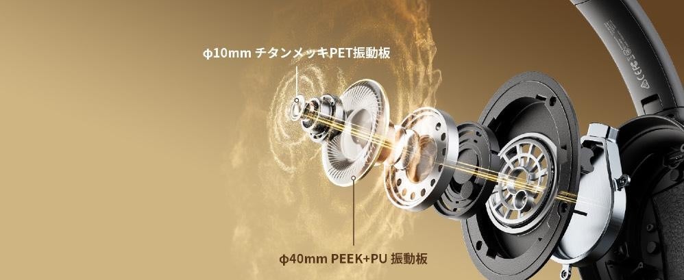 ブランド初となるデュアルダイナミックドライバーを採用、中低音域を担当する40mm径ダイナミックドライバーと、高音域を担当する10mm径ダイナミックドライバーを同軸上に配置しました。振動板の素材も慎重に検討し、耐熱性と強度、内部損失に優れることから、40mm径振動板にはポリエーテルエーテルケトン(PEEK)、10mm径振動板にはポリエチレンテレフタレート(PET)を採用しています。2基の振動板は互いに干渉せず高い同期性を保ち、音の歪みを抑制するとともに、位相特性に優れた自然な描写を実現します。