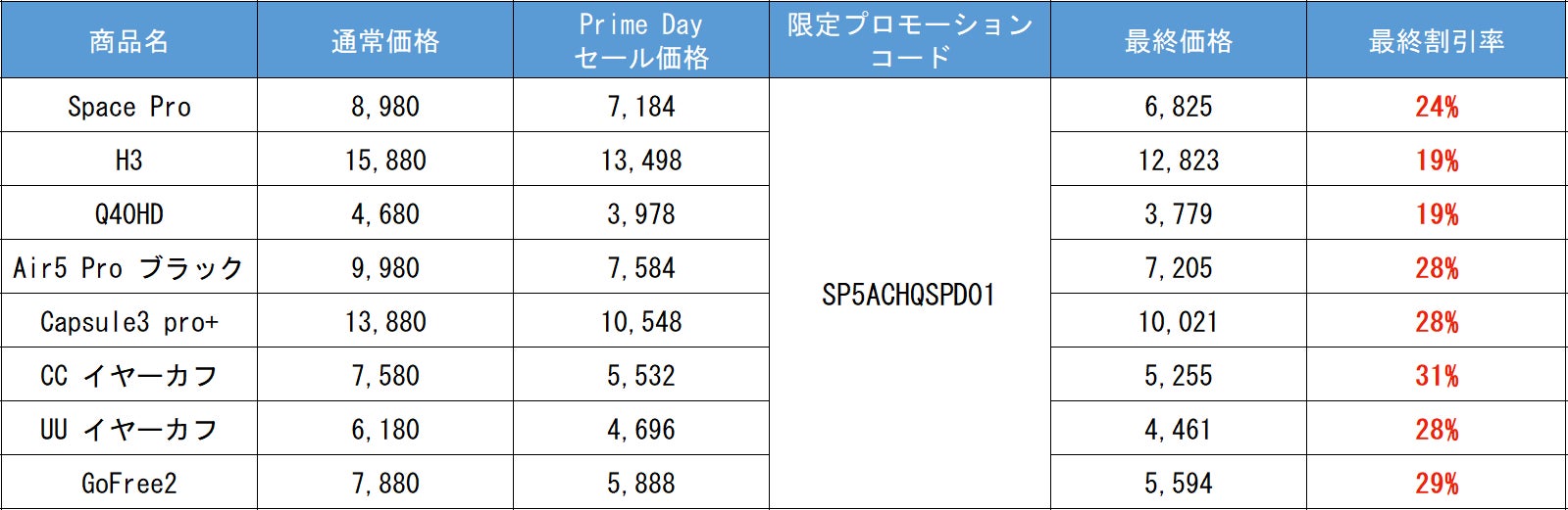 7月8日から開催される「Amazon プライムデー・プライムデー先行セール」において、弊社製品の特別セールを実施します。LDAC対応にバージョンアップした「CCイヤーカフ」が最終割引率31%でのご提供になるなど、最新製品も大変お求めやすい価格に設定しております。この機会にぜひお買い求めください。