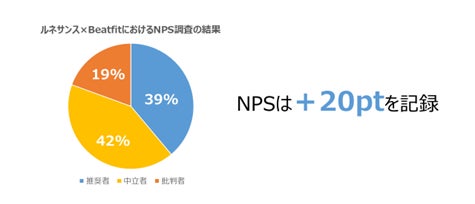 1年半にわたり、ルネサンス会員の中でBeatfitを利用したことのある方にアンケートを実施したところ、NPS®※で+20ptを記録し、ご利用者の顧客満足度が向上したことをお知らせします。