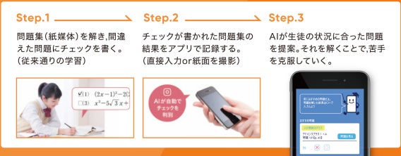 生徒は通常通り問題集(紙媒体)を解き、その結果をアプリで撮影することで、AIが生徒の状況に合った問題を提案します。その問題を解くことで、生徒は苦手を克服していくことができるアプリとなっています。