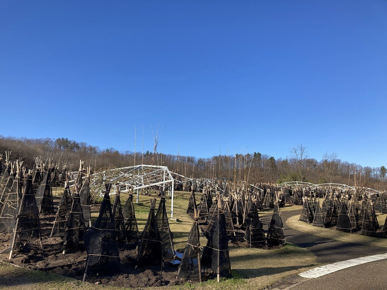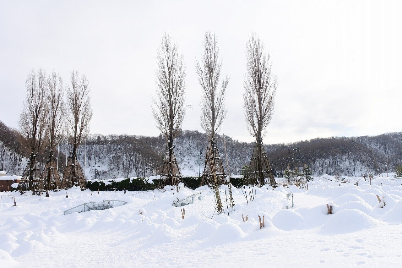 ●竹と寒冷紗で作られた「とんがり帽子姿」の冬囲いは、雪国のバラ園ならではの風景です!