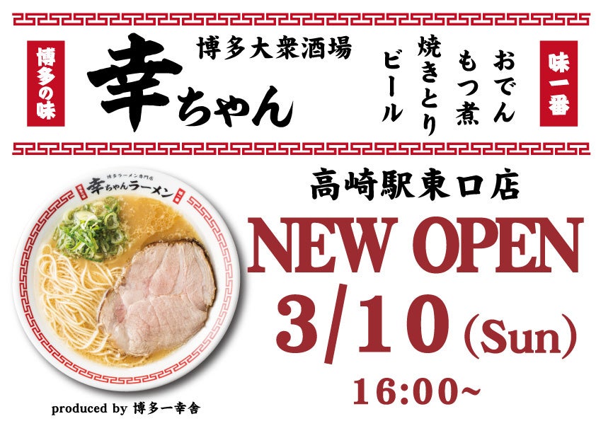 豚骨ラーメンの本場博多にて、2004年に創業し今年3月に20周年を迎えた元祖泡系『博多⼀幸舎』がプロデュースする『幸ちゃんラーメン』は、福岡県内で7店舗を展開しており、昨年11月にオープンした福岡空港店は空港施設内の飲食部門において上位の売上を誇る店舗です。また今年3月13日にオープンしたばかりのJR博多シティ デイトスアネックス内の博多駅筑紫口店は、オープン直後より地元の方、国内、海外からの観光の方が多数ご来店くださり、大変好評をいただいております。この度の出店は2023年2月に群馬県初上陸に加え、初のラーメン居酒屋形態 として出店した『博多大衆酒場 幸ちゃん』の2号店目となります。1号店目の人気メニューである鉄板焼肉をはじめ、透明な出汁のおでんや博多発祥のくるくる鶏皮串など、博多の名物がたくさん味わえます。また締めには本場博多の味である「幸ちゃんラーメン」が楽しめ、心ゆくまで博多グルメがご堪能いただけます。