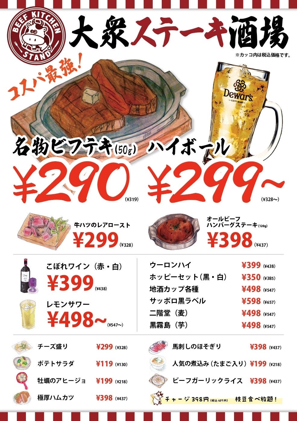 「サブカルの聖地」秋葉原電気街口に名物ビフテキ290円(319)の大衆ステーキ酒場ビーフキッチンスタンドがやってきた!7月11日17:00-21:00までは何杯飲んでも0円ハイボールキャンペーン