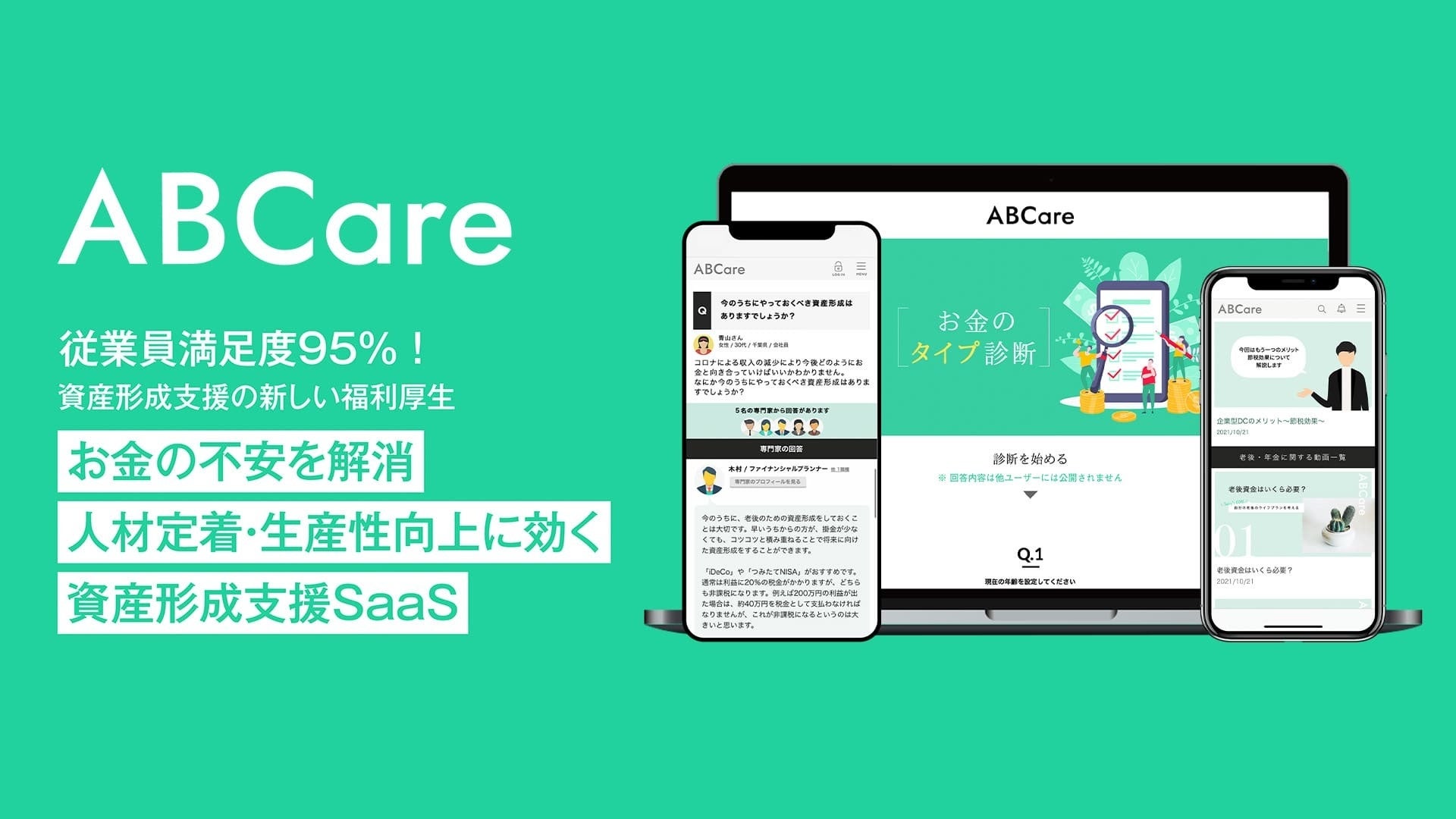 「ABCare」は、従業員のお金の不安をなくし、企業の人材定着やエンゲージメント・生産性向上を実現する、テクノロジーを活用した資産形成支援サービスです。累計受講者17,000人以上のお金のデータを活用した3つの機能、お金のタイプ診断・金融教育動画・専門家チャットを用いて、従業員のニーズに寄り添った資産形成のサポートを提供しており、ベンチャー・大手企業に多数導入いただいています。