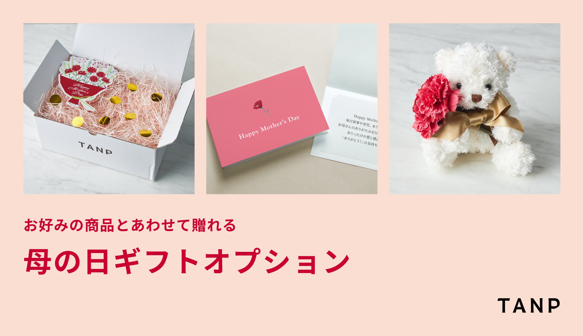 TANPでは、母の日にぴったりなスイーツギフトや雑貨ギフトを始め、様々なギフト商品を随時公開しています。住所を聞かなくてもカタチのあるギフトを贈れる「eギフト」や、母の日に一緒に贈ることができる豊富なオプションサービスもございますので、是非ご利用くださいませ。