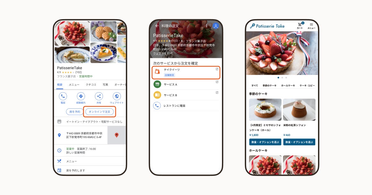 注文ユーザーは、Google 検索および Google マップから、お店がオンライン注文を受け付けていることを知り、テイクイーツを経由してそのまますぐに注文を行うことができます。