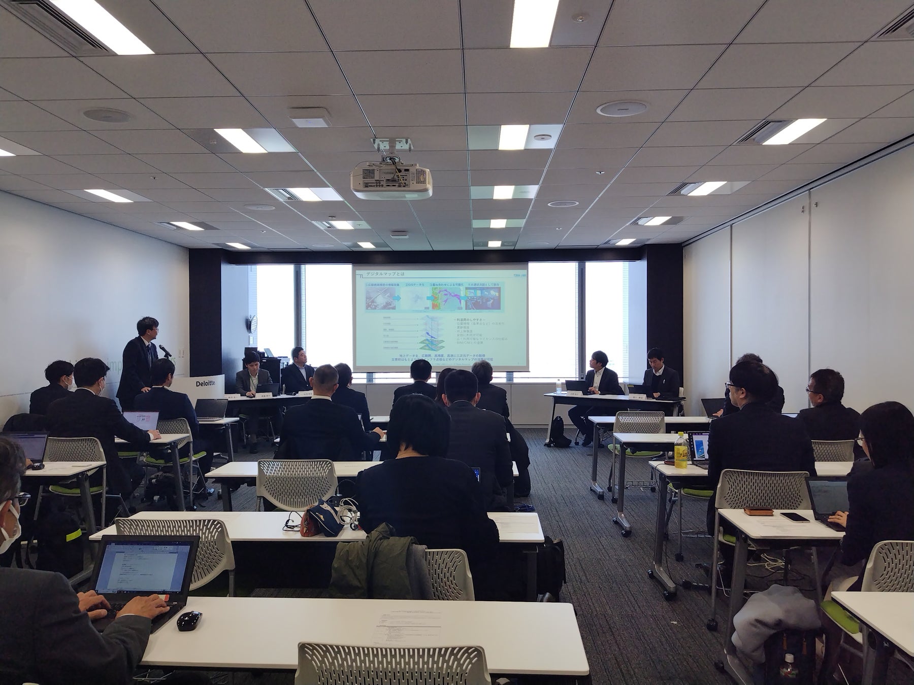 第1部は、「広範囲、高精度のデジタルマップの有効活用について」をテーマに、デジタルマップのプラットフォームを提供する各社からデジタルマップの災害時における取り組み事例や、デジタルマップのソリュションの提案、インフラ設備の点検の定期化・自動化についての説明が行われました。