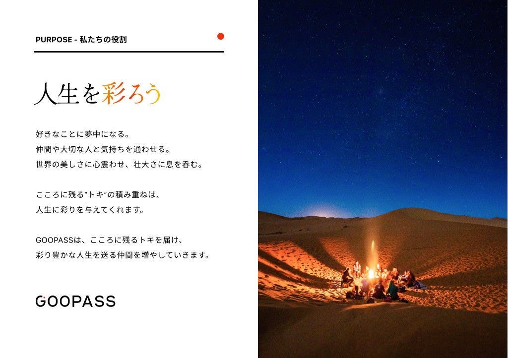 私たちGOOPASS株式会社は、こころに残る”トキ”を過ごすための手段やきっかけを提供することを通じて、社会に「人生を彩る仲間」を増やしてまいります。