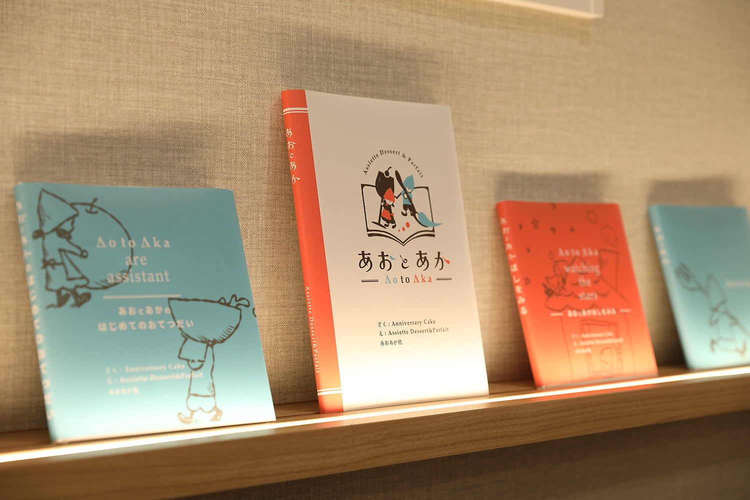 『あおとあか』のロゴマークをはじめ、店舗デザインやWebデザインなどのブランディング・デザイン全般を『コムデザインラボ』が担当。絵本をモチーフとした世界観によって、オーナーパティシエが作り出す独創的でストーリー性のあるスイーツをデザインでも表現しました。
