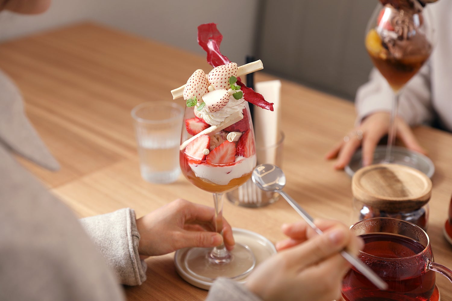 『あおとあか』では、大切な記念日や友人との優雅な休日、自分へのちょっとしたご褒美に使っていただける空間をご用意。オーダーを受けてから丁寧に仕上げるアシェットデセールとパフェは、旬の食材を使って思いを込めて仕上げるオリジナリティのある一皿です。