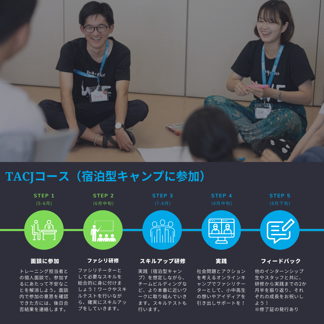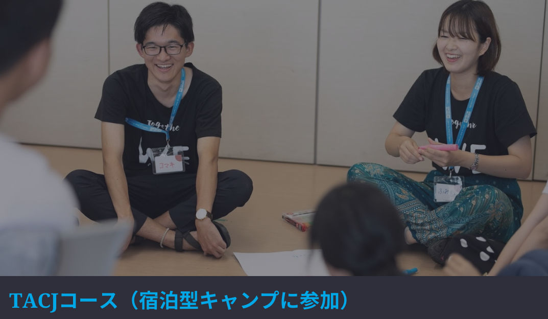 コースは2種類で、サマーキャンプに参加する「テイク・アクション・キャンプTACJコース」(オンライン+対面)と、11月のオンラインイベントの企画運営に関わる「WE TALK "SOCIAL"(WTS)コース」(すべてオンライン)。両コース共通のファシリテーション研修を経て、各コースに分かれます。