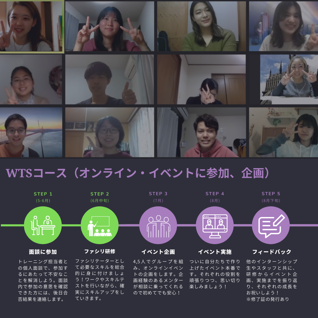 WE TALK "SOCIAL"(WTS)は、小学生から大学生までの様々な世代の子ども同士で社会問題について学び、語り合うイベント。11月の本イベントの運営を目標に、ファシリテーションの基礎を習得した後、8月にテストイベント「WE TALK "SOCIAL"大学生企画」を開催、参加者でチームを組み企画・運営に取り組みます。子どもたちのファシリテーションの他、有意義なオンラインイベント企画運営のスキルを習得します。