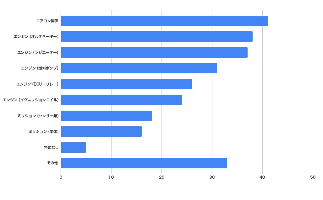 また、2位から6位の回答がエンジン関係となっており、ミッション関係の故障よりも多いことが伺えます。その他の回答としてはパワーステアリングの故障やオイル漏れという回答が多く見受けられました。「特になし」と回答したユーザーも僅かながらいたことから、旧車でもほとんど整備を必要とせず、定期点検だけで済む車種もあることが読み取れます。