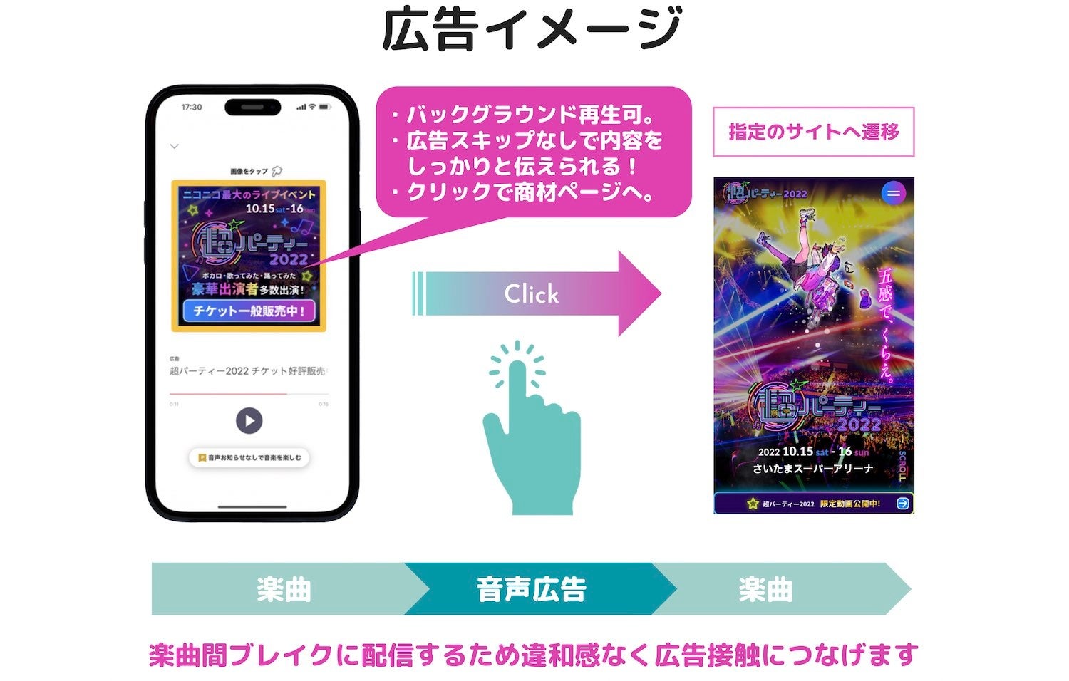 またバックグラウンド再生にも対応しており、スキップ不可の音声広告であるため広告メッセージをきちんとリスナーに届けることができます。