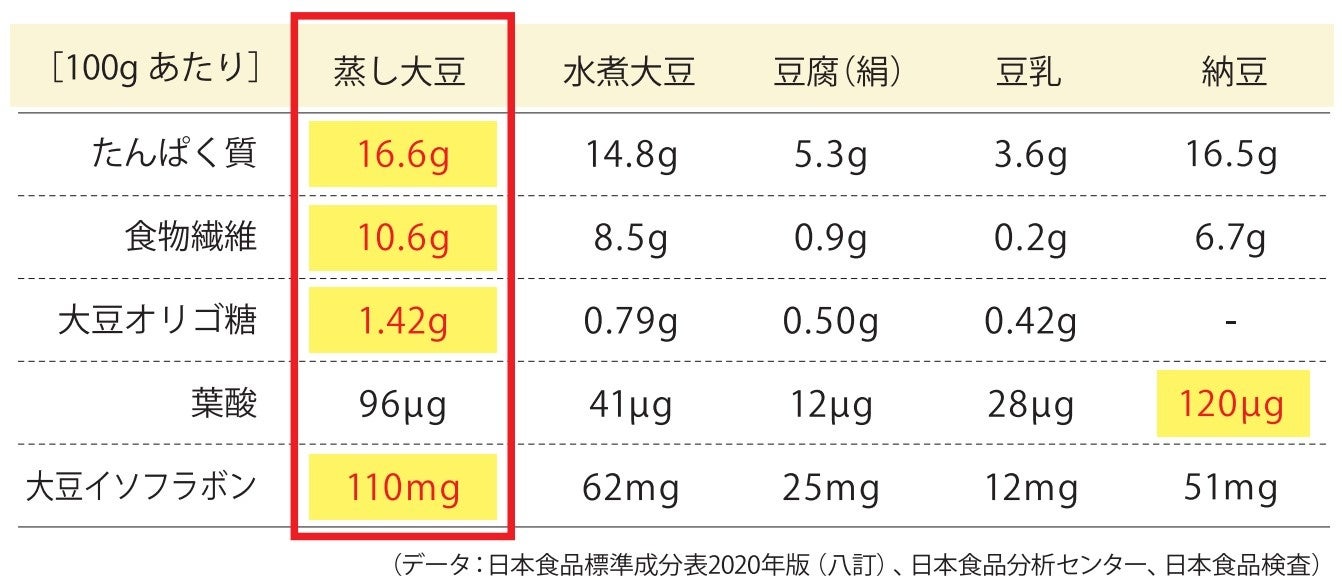 ※日本食品分析センター調べ(蒸し大豆:マルヤナギ小倉屋)、水煮大豆:日本食品標準成分表2020版(八訂)黄大豆・ゆで