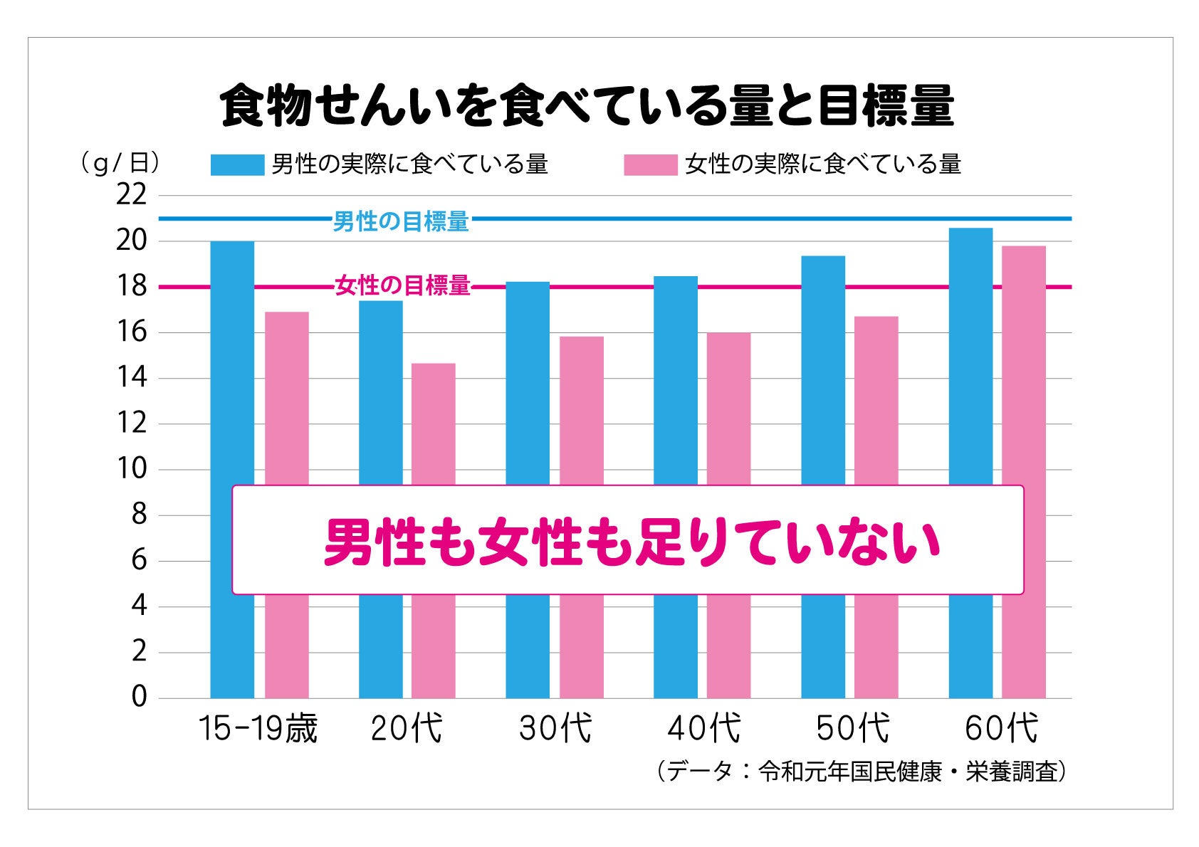 このように、食物繊維は現代人が積極的に摂りたい栄養素ですが、日本人は慢性的な食物繊維不足となっています。厚生労働省「日本人の食事摂取基準2020年版」では食物繊維の摂取目標量は、18歳~64歳では1日あたり男性21g以上、女性18g以上と定められていますが、「令和元年国民健康・栄養調査」によると、男女ともに目標値に足りていません。