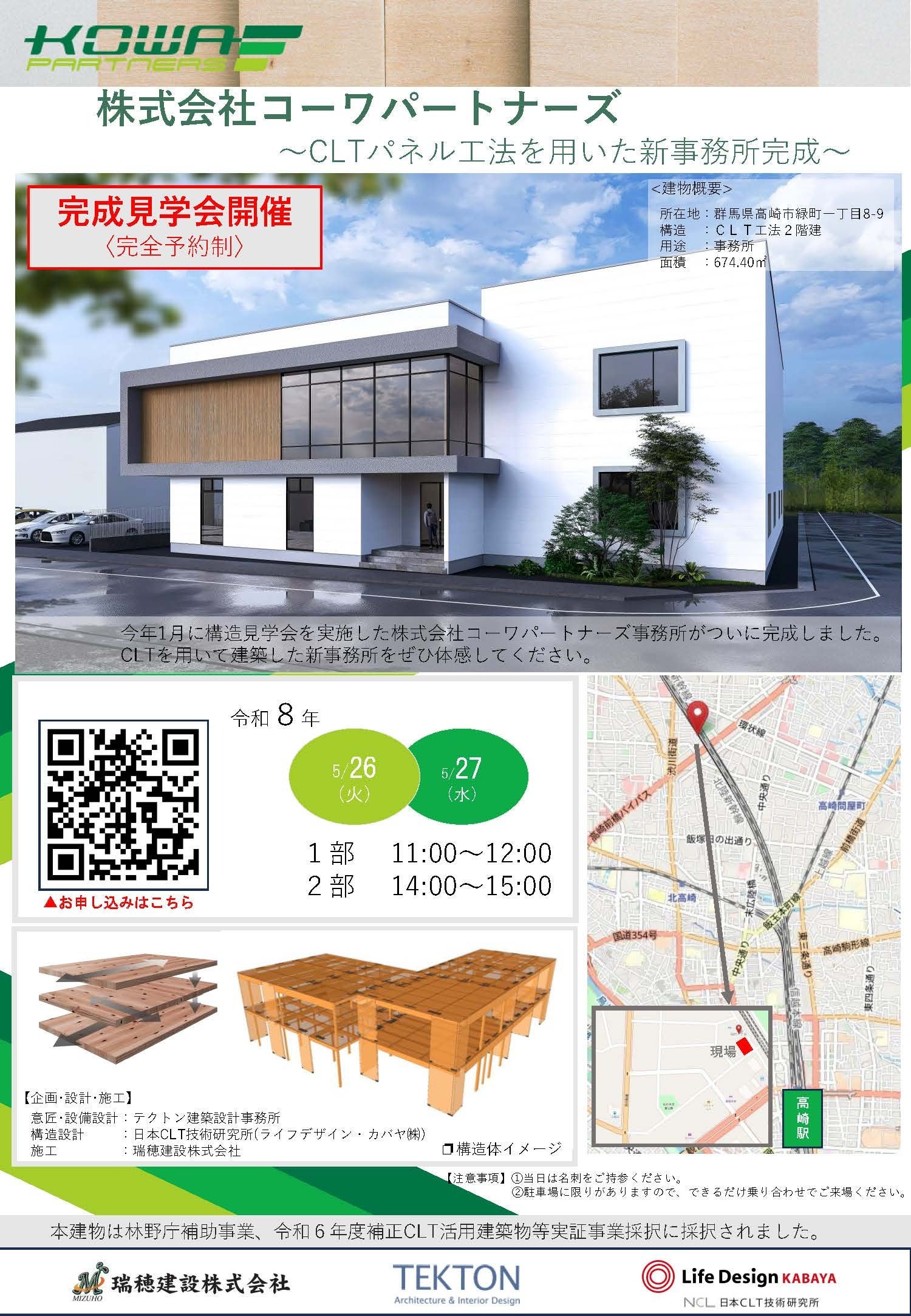 ライフデザイン・カバヤ株式会社(代表取締役社長:窪田健太郎/本社:岡山県岡山市)が運営する、CLTフランチャイズネットワーク本部『日本CLT技術研究所』の加盟企業である瑞穂建設株式会社(代表取締役:篠原玄洋/本社:群馬県渋川市)が現在CLTパネル工法にて建築中の、株式会社コーワパートナーズ(代表取締役:杉木基泰/本社:群馬県渋川市)の新事務所において、2026年5月26日(火)、27日(水)の2日間、完成見学会を開催いたします。