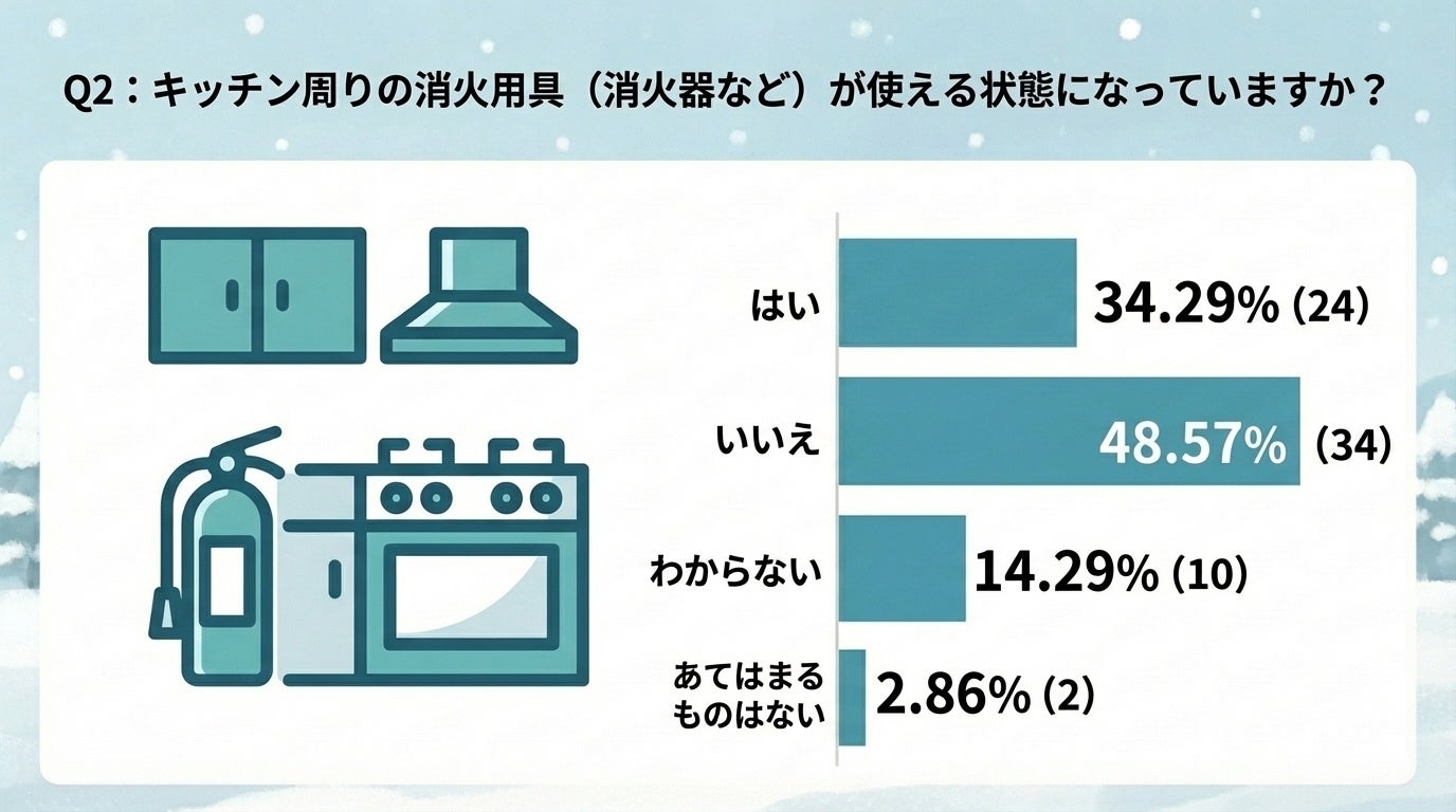 キッチン周りの消火器などについて「使える状態になっていますか?」と尋ねたところ、「はい」は24名、「いいえ」は34名(約49%)でした。消火用具が設置されていても、すぐに使える状態で管理されていない家庭が少なくない実態が明らかになりました。