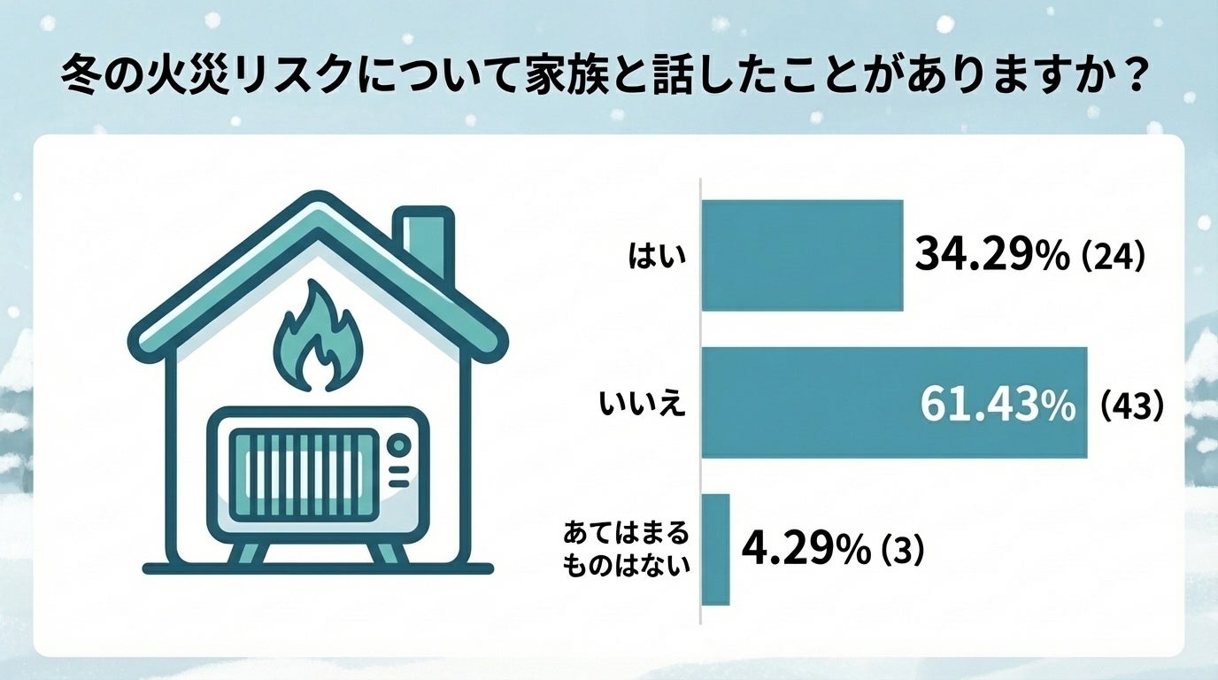 「冬の火災リスクについて家族と話したことがありますか?」という設問に対し、「はい」と回答したのは24名にとどまり、「いいえ」は43名(約61%)と多数を占めました。火災発生時の行動や役割分担について、家庭内で共有されていないケースが多いことがうかがえます。