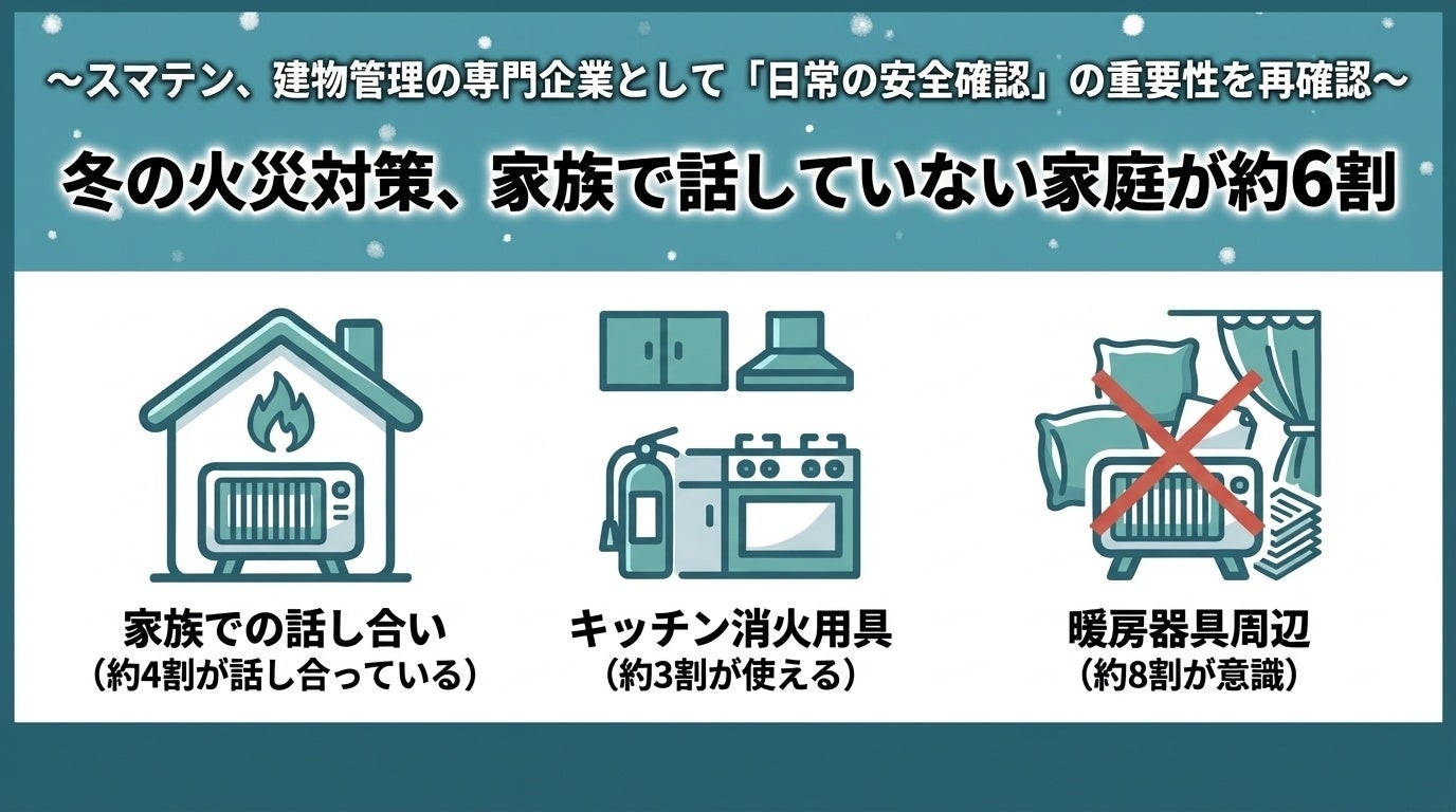 冬は暖房器具の使用増加や空気の乾燥などにより火災リスクが高まる季節です。日常的な注意は一定程度行われているものの、設備の確認や家族間での共有といった行動まで十分に及んでいない実態が浮き彫りとなりました。