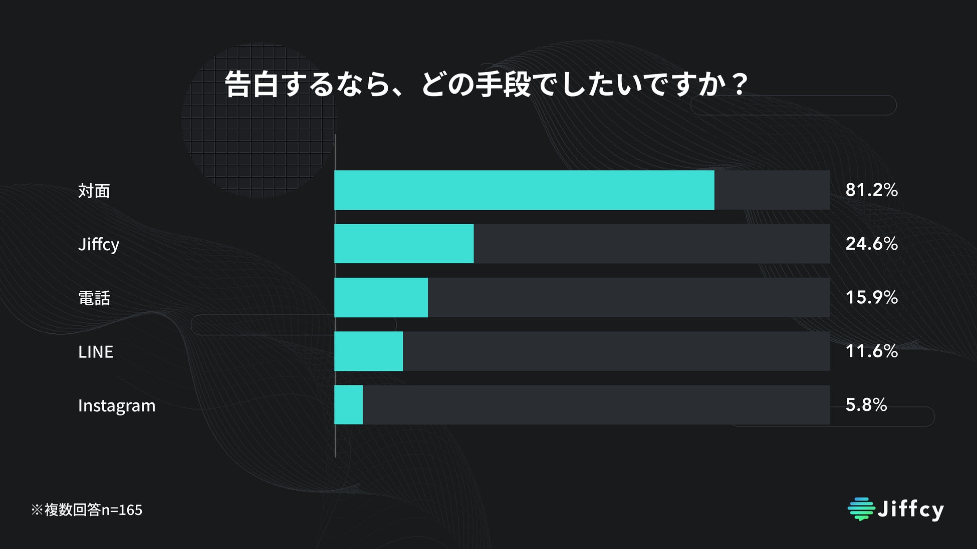 「告白するなら、どの手段でしたいですか?」という質問に対して、一番多かった回答は「対面」(81.2%)、次に「Jiffcy」(24.6%)、「電話」(15.9%)という結果となりました。