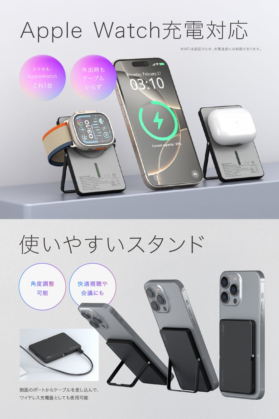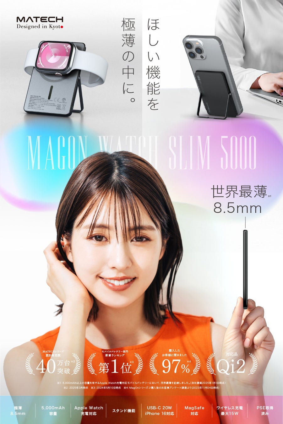 【Apple Watchも対応】世界最薄8.5mmのQi2搭載モバイルバッテリー「MagOn Watch Slim 5000」新登場