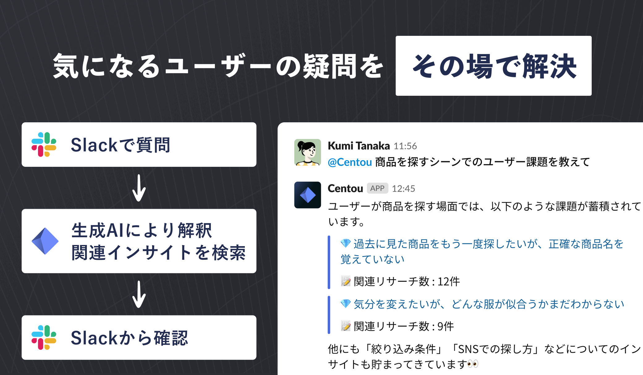 Slack上でやりとりされるような、自然な会話形式で「この場面でのユーザー課題は?」などと質問することで、Centou独自の生成AIがこれまで社内に蓄積されたユーザーインサイトを検索して返答します。
