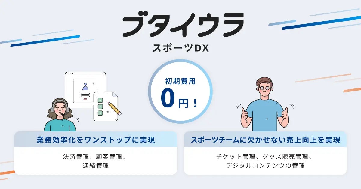 ブタイウラは、スポーツチームのDXの推進を支援します。ファンクラブの決済管理・顧客管理・連絡管理をワンストップで提供し、業務効率化を実現します。また、オプションとして、チケット管理・グッズ販売管理・デジタルコンテンツの管理といったスポーツチームに欠かせない売上向上を実現する機能も充実しております。