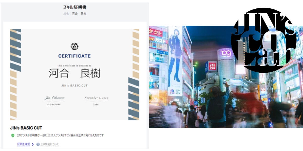 また、本サービスの第1弾として、一般社団法人JIN‘s Co Labが認定する「JIN‘s BASIC CUT」の10月度技術講習修了証の証明を行いました。受講生は協会から提供されるURLを使用し、Web3規格に準拠した形で正当に技術を証明することが可能になります。
