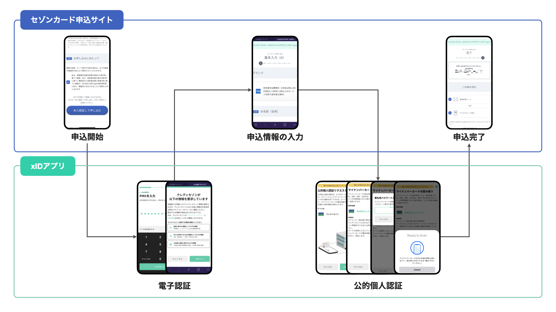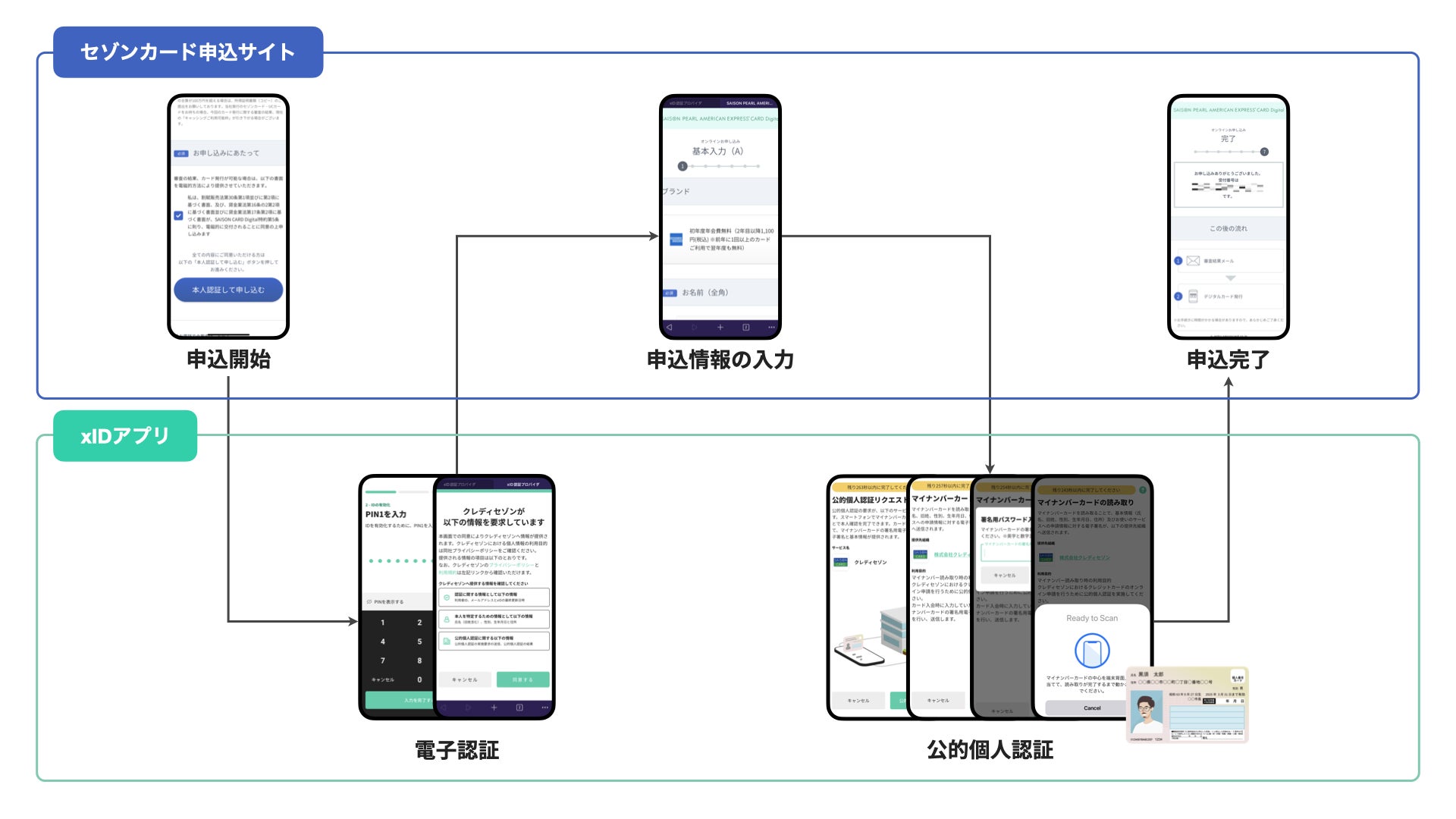セゾンカード入会申込時の本人確認に、マイナンバーカードに特化したデジタルIDアプリ「xID」を活用します。利用者は入会申込時にxIDアプリを使って公的個人認証を実施することで、簡単に本人確認を完了することが可能です。
