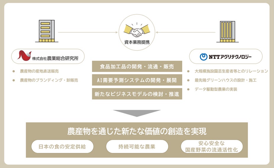 株式会社農業総合研究所(本社:和歌山県和歌山市/代表取締役社長 堀内 寛、以下「農業総合研究所」)と株式会社NTTアグリテクノロジー(本社:東京都新宿区/代表取締役社長 酒井 大雅、以下「NTTアグリテクノロジー」)は、日本の食の安定供給、持続可能な農業の実現、安心安全な国産野菜の流通活性化といった、農産物を通じた新たな価値の創造に向けた一連の取り組みを共同で進めていくことに合意し、2024年9月3日(火)に資本業務提携契約を締結します。