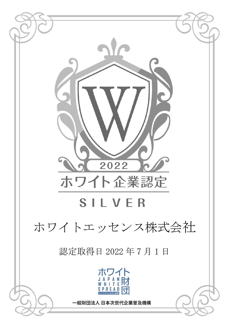 ホワイトエッセンス株式会社が、一般財団法人日本次世代企業普及機構(通称:ホワイト財団)が運営する「ホワイト企業認定 シルバー」を取得しましたことをお知らせいたします。