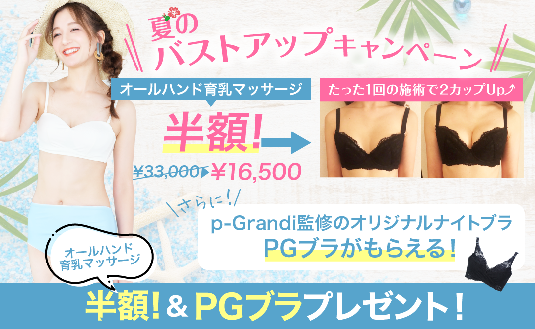 夏のバストアップキャンペーン開催!PGブラプレゼント&オールハンド育乳マッサージ驚愕の特別価格!
