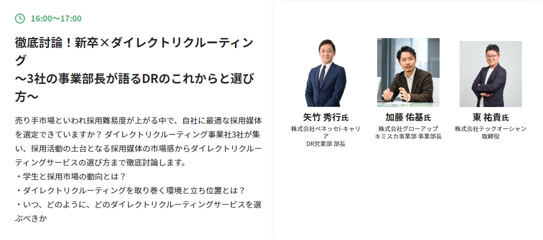 今回、3講演ご用意しております特別セッションでは、大学キャリアセンター、業界著名人や最新動向に精通したスペシャリストたちが「新卒採用」をテーマに語り尽くします。