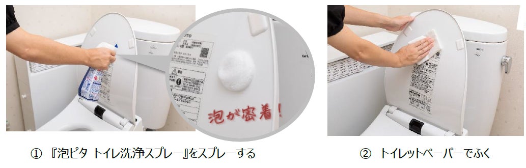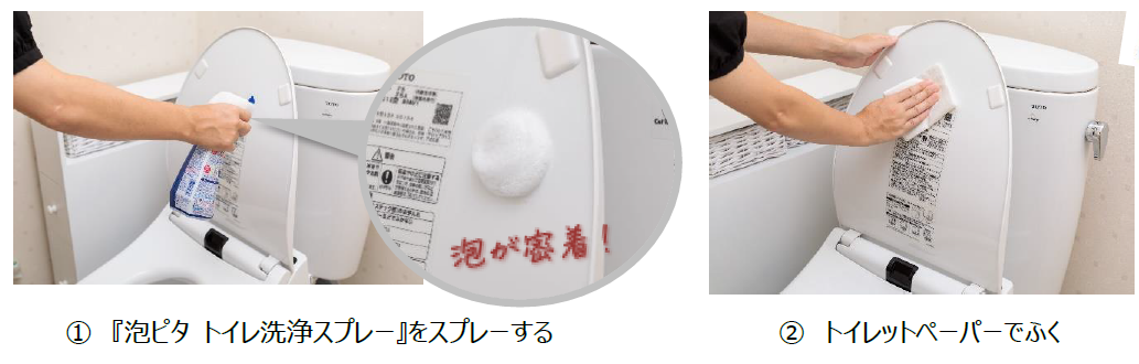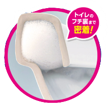 (3) 洗いにくいフチ裏には、密着泡をプッシュ~とかけて、60秒後に流すだけ!