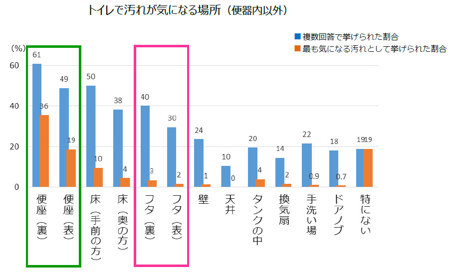 トイレで汚れが気になる場所を聞いたところ、「便座の裏」を挙げた人が最も多く約60%、最も気になる場所としても約30%の人が挙げており、トイレの気になる汚れの筆頭格として生活者の意識が高いことがわかります。