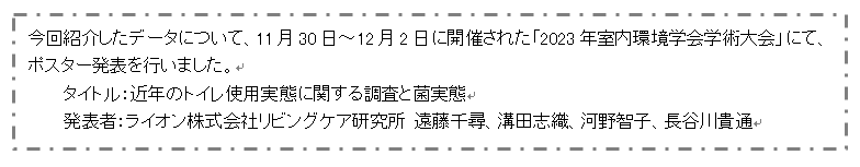 この度、コロナ禍を経た変化や、2021年に発売した『ルックプラス 泡ピタ トイレ洗浄スプレー』※1 に関連して得られた新しい結果を、本シリーズの続編として再開し、数回にわたって発表していきます。続編の第1弾(初回からは第9弾)では、コロナ禍で注目された「トイレのフタ」に焦点を当て、生活者の意識や実態に関する調査を実施、さらにトイレを流す時の水の飛び散りによる汚染について検証しました。その結果、以下のことがわかりました。