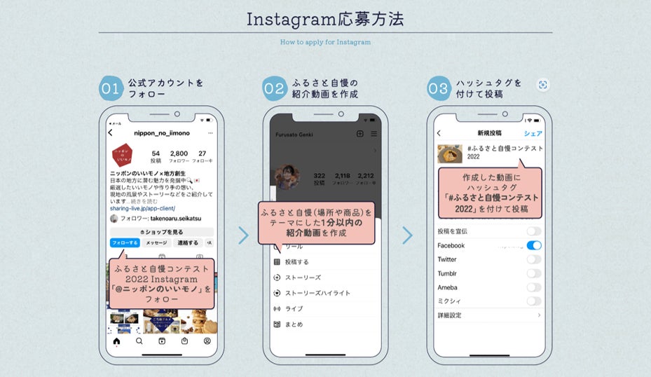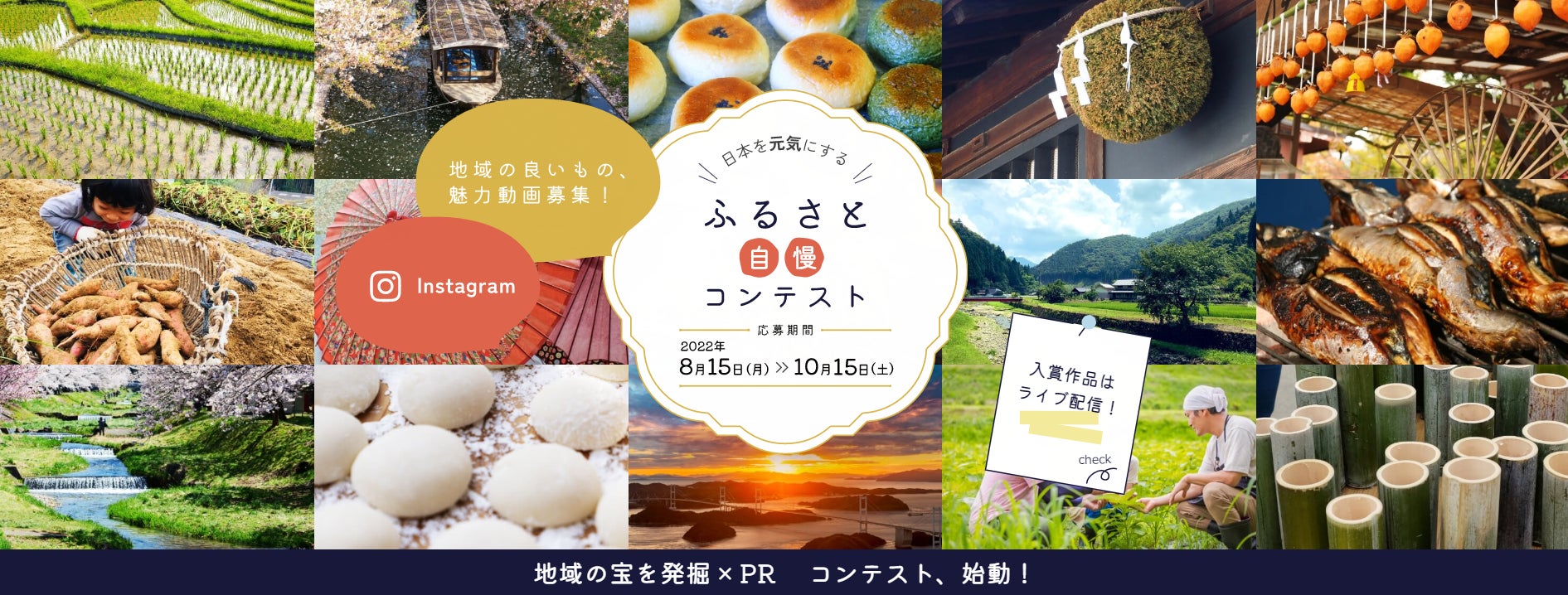 コロナ禍で多くの地域がさまざまな課題を抱える中、「日本中を元気にしたい」という思いから企画した、新しいマーケティング手法であるライブコマースを活用したイベントです。Instagramからかんたんに応募ができ、入賞作品は賞金10万円等のほか、12月に行われるライブ配信にてゲストによる作品紹介やライブコマースを予定しています。