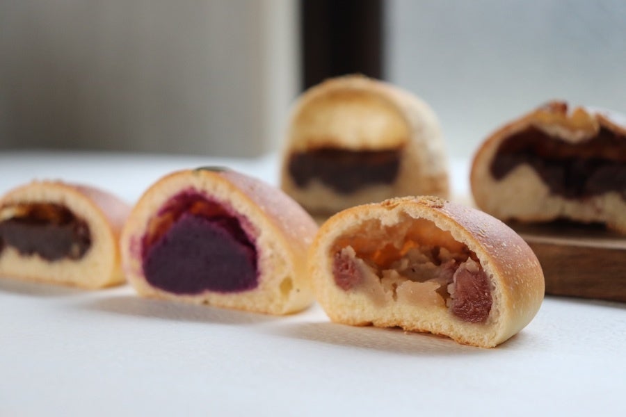 色々な種類のあんぱん5個と、いちあんのカンパーニュや人気アイテムのスコーンを含む8個のパンのセットです。 ・紫いもあんぱん